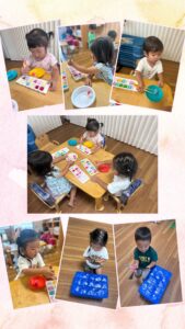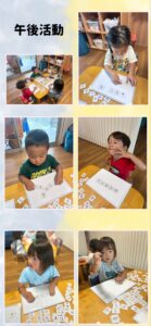 午後活動は、紐通し、箸、名前、ハサミをしました。名前の練習では沢山あるひらがなの中から自分の名前の文字を探してマグネット貼ることをし、その後に鉛筆を持ち、名前をなぞり、書く練習を保育者と一緒にやりました!少しずつ書き順なども覚えながら練習できるようにしていきます。箸ではポンポンボールを掴む練習をしました。