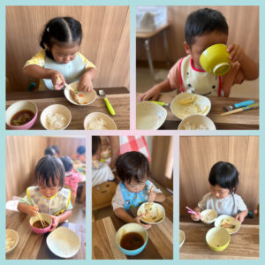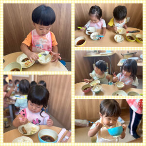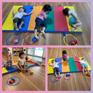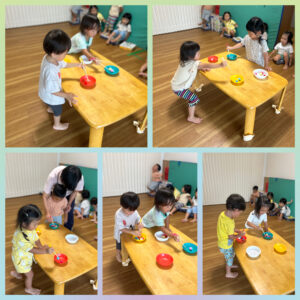 帰園後は劇や英語遊びをしてから、シャワー浴で汗を流し、すっきりした状態で、給食を食べることができました。給食では、箸を使って最後まで自分で食べきることができた子もいて、「先生みてーきれいに食べた!」と教えてくれました(^^)少しずつ自分でできることが増え、自信へとつながっている様子が見られ、嬉しく感じます(^^) 午後活動では、鉄棒の前回り、英語、マット運動、ジャンプボールリレーやポンポンボールを箸で挟み、お皿に移すという活動をしました。1つの活動から様々な工夫を加え、楽しく色々なことが出来るりんご組さん!毎日様々な可愛い表情を見せてくれたり、そんな会話が子ども同士で出来るの!?というやり取りや、面白い一面もあります^^これからもそんな子どもたちの姿を大切にしながら、活動を楽しくやっていきたいと思います。