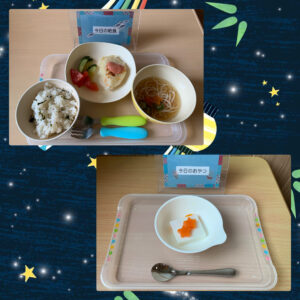 おやつは、七夕ゼリー。牛乳寒天にキャロットジュースで作った星型のゼリーをトッピング!「おかわりくださいー!」とつるんとしたゼリーをたくさん食べました。