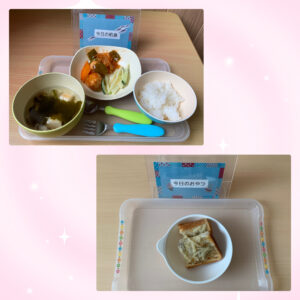 副菜は、シャキシャキサラダ。千切りにしたじゃがいも、きゅうりのサラダです。シャキシャキとした歯応えがあり、よく噛んで食べていましたよ(^^)