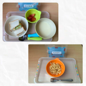主食は、サンドイッチ!たまごサラダときゅうり、照り焼きチキンの2種類です。あまり登場しないメニューなので、テンション高めの子ども達でした♪おかわりをした子は、たまごかお肉を自分で選んでいましたよ(^^)