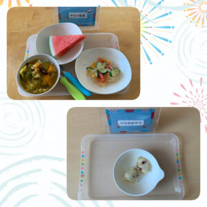 デザートは、すいか。すいか割りをしたからか、何個も食べたくておかわりをして食べました。みんな上手にかぶりついていましたよ。