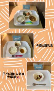 おやつは、蒸かし芋。さつまいもを蒸して、ごま塩をパラパラッとかけたシンプルなおやつです。離乳食を食べている0歳児さんも、みんなと同じおやつが食べることができて嬉しそうでした(^^)