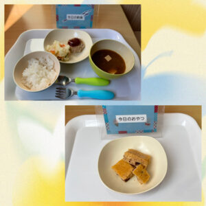 主菜はみんなが大好きなハンバーグです。国産の豚ひき肉に炒めた玉ねぎを混ぜ、よくこねて柔らかくしたハンバーグ。「おいしい~!」と嬉しそうに食べる子ども達でした(^^)