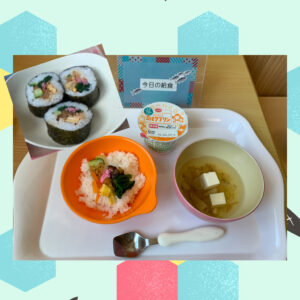 今日は節分。主食の恵方巻きには、卵、ツナ、しいたけ、かんぴょう、きゅうり ほうれん草、人参の7種類の具材が入っています。0、1歳児さんは食べやすいようにちらし寿司にして、2歳児さんは自分で具材を乗せ、恵方巻きを巻いて食べました。みんなが1年間元気に過ごせますようにと願いを込めた恵方巻き、みんなおいしそうにパクパク食べていましたよ!