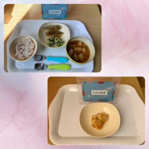 おやつはアメリカンドッグ。魚肉ソーセージにホットケーキ生地を絡め、薄油で焼きました。表面はサクッと、中はふわっとしていて、子ども達にも人気のおやつです!あっという間に完食でした(^^)